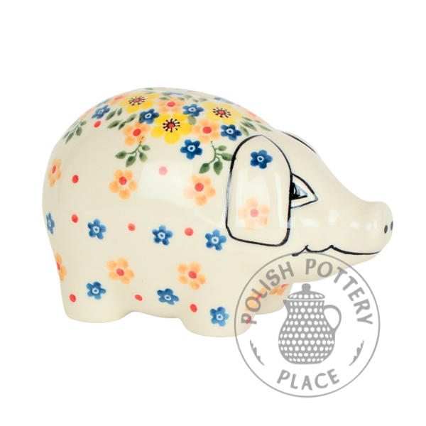 Built with sturdy ceramic walls and an air-tight rubber plug underneath, you can trust this cute little pig to keep your change safe! His slot is big enough for all coin sizes, as well as single folded bills. Fun for adults and children! Handmade in Bolieslawiec, Poland, it is chip and scratch resistant, lead and cadmium free. Dishwasher safe.
