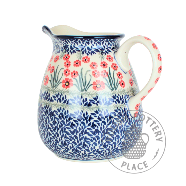 This classic pitcher will bring beauty to any meal.  Perfect for serving iced tea, lemonade, juices, or water, but also makes a stunning vase for fresh flowers from your garden! Handmade in Boleslawiec, Poland, it is chip and scratch resistant, lead and cadmium free.  Dishwasher safe.